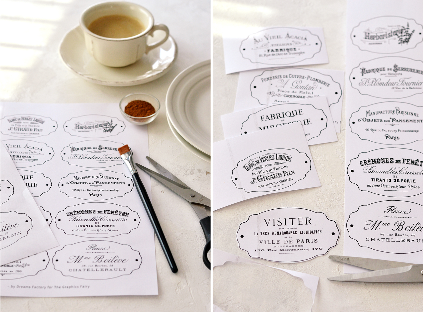 Of course, it all starts with the French labels that I designed especially for this project. I just love coming up with new ways of using the beautiful graphics from The Graphics Fairy and sort of reinventing them over and over again for specific projects. The labels have a beautiful rounded border and some ‘nail’ marks on the sides, that will help enhance the rusted vintage feel I was envisioning.