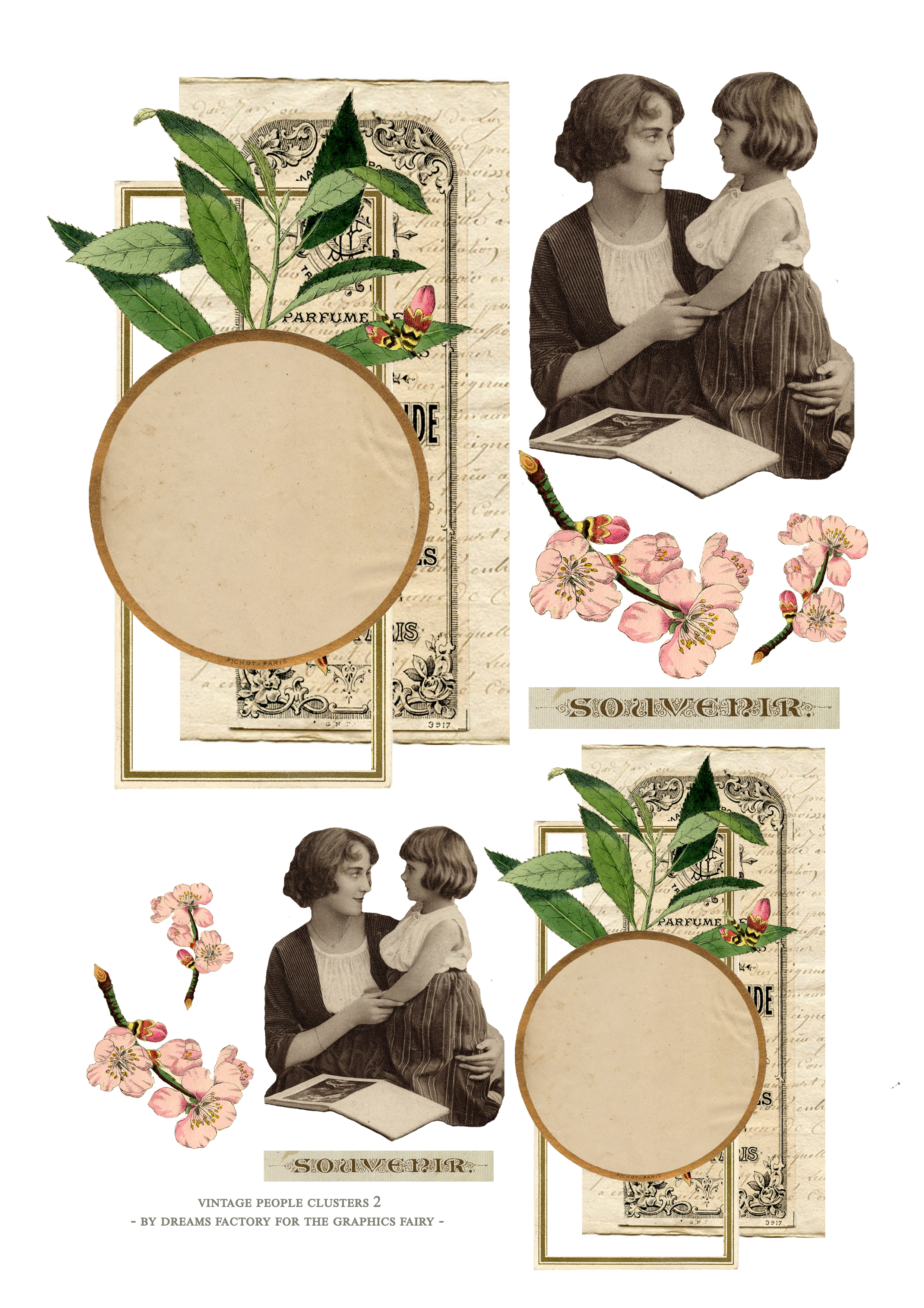Hello Graphics Fairy friends! I’m Diana from Dreams Factory and I’m happy to be here again for another one of our creative get-togethers. Today, I have a new and exciting project to share with you, I will show you how to make these gorgeous Vintage People Clusters for your junk journals. This might sound complicated at first glance because of all the layered elements, but in fact, it is one of the easiest projects ever! And the final results are absolutely amazing!