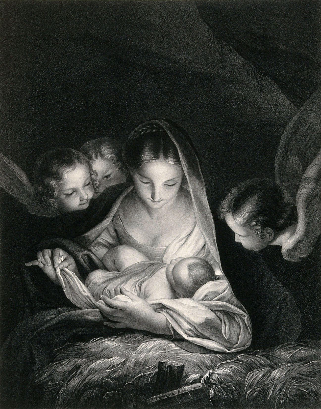 Here is the latest addition to this collection. This is such a beautiful Antique engraving! Here we see Mary looking adoringly at the baby in her arms. There are 3 sweet Cherubs peeking over her shoulder with gleeful expressions. So sweet!