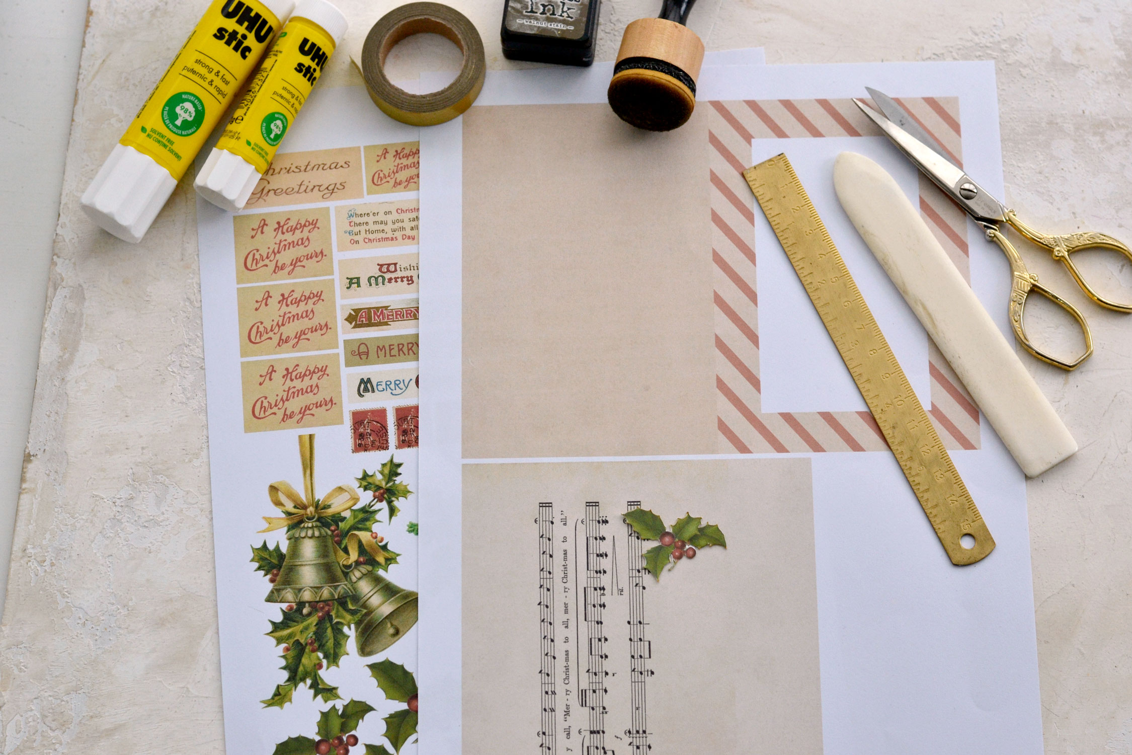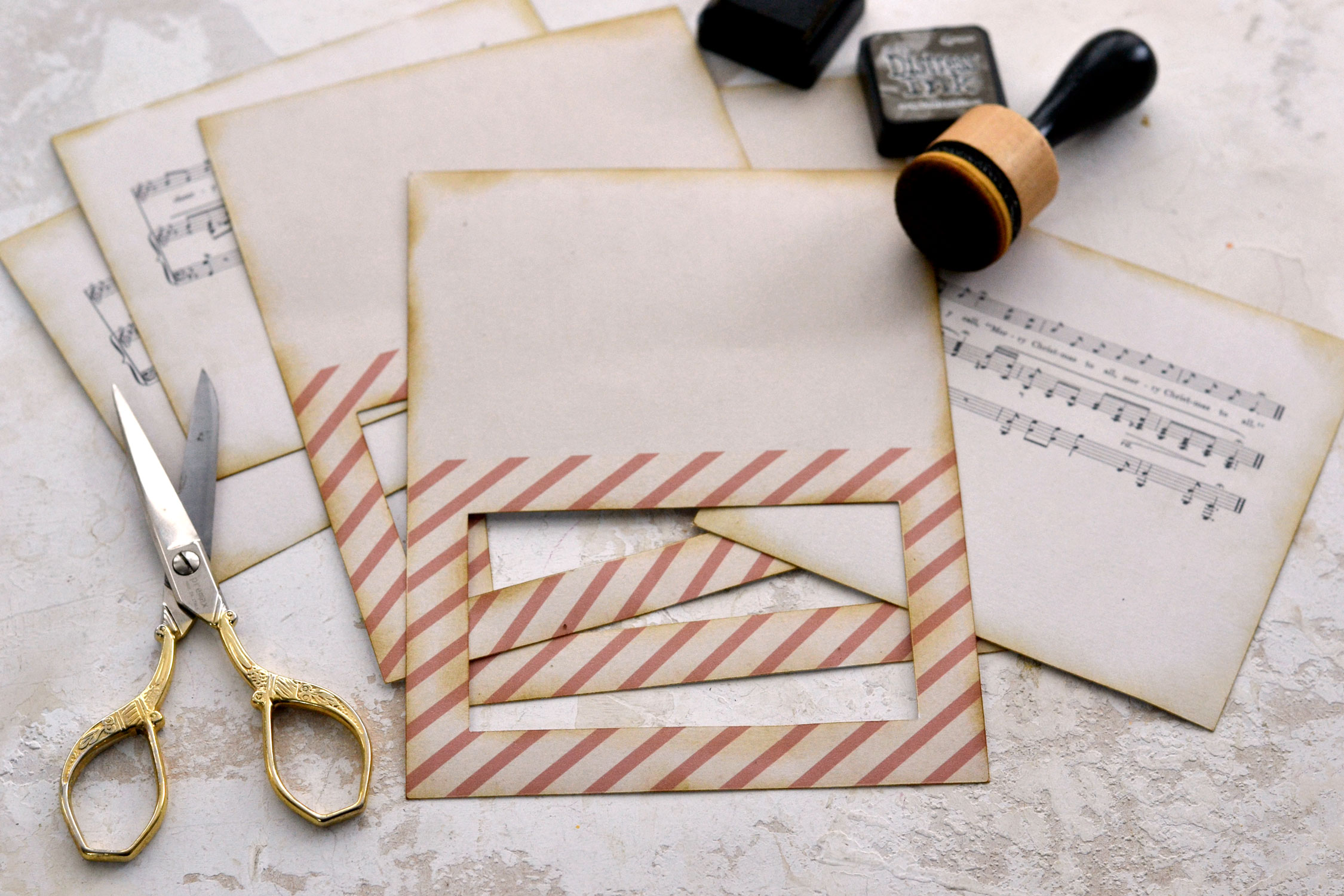 Print and cut as many card bases as you want, then use distress ink to give the paper even more of a vintage vibe. I love using the Walnut Stain from Ranger, to which I added a drop or two of Wild Honey distress ink, it’s definitely my latest go-to combo for all my projects.