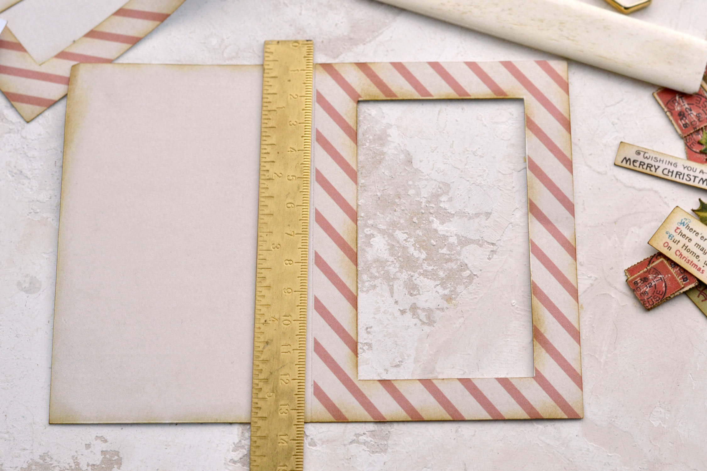 Place your card base with the red striped frame on your table vertically. Use a ruler and a bone folder to score a line right where the red stripes end.