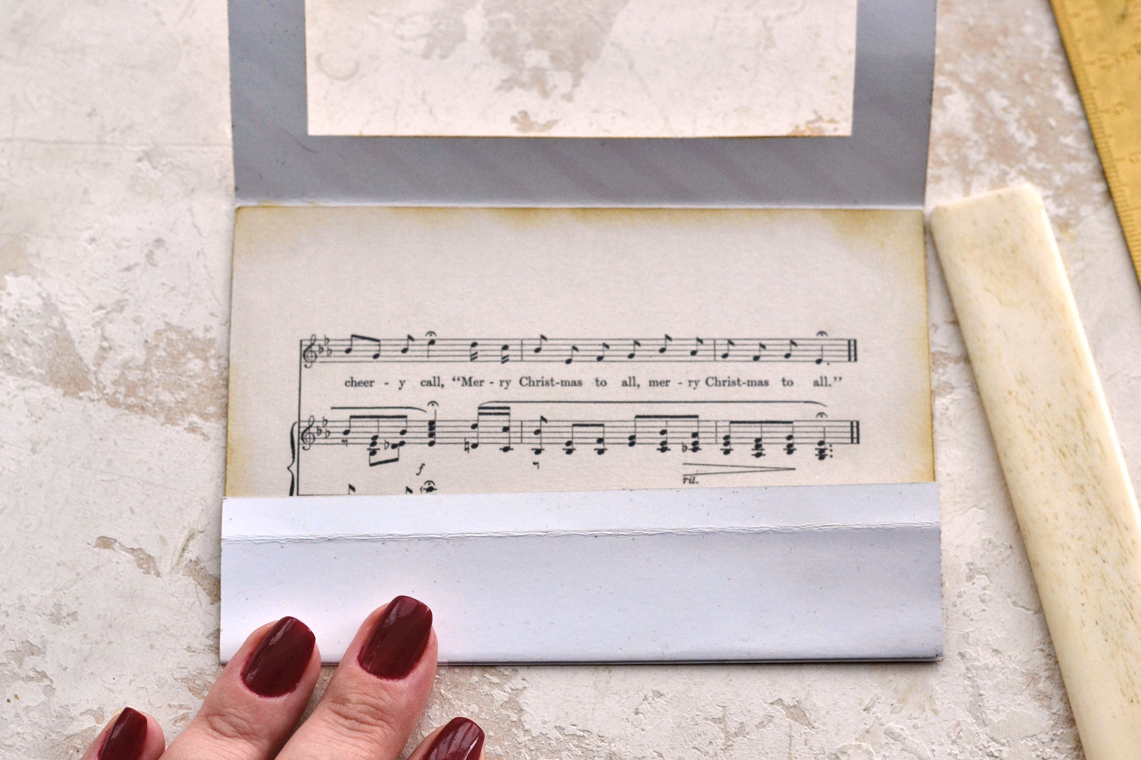 Open your card base and place it horizontally on your table. Add paper glue to the whole surface of the bottom and adhere the music sheet on top. The music sheet will have a small section at the bottom that will go outside our card base. Press the glued area with your fingers and make sure it dries completely before moving on.